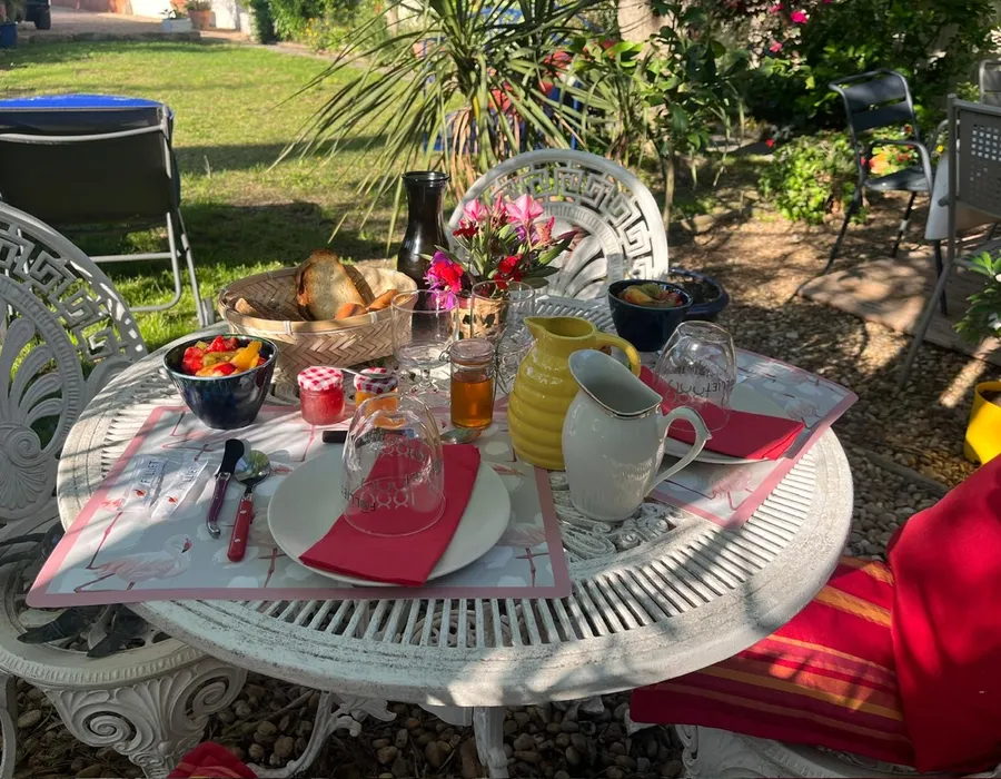 Chaque matin, profitez de votre petit-déjeuner servi directement sur votre terrasse privée, dans le calme du mas et la douceur du jardin environnant.